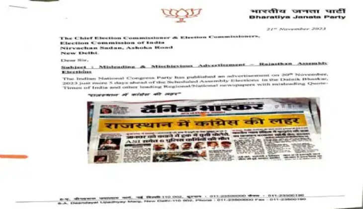 नई दिल्ली, 21 नवंबर (हि.स.)। भारतीय जनता पार्टी (भाजपा) ने राजस्थान में कांग्रेस के विज्ञापन पर आपत्ति जताते हुए मुख्य चुनाव आयुक्त से कार्रवाई की मांग की है। मंगलवार को भाजपा के चार सदस्यीय प्रतिनिधिमंडल ने मुख्य चुनाव आयोग मुख्यालय में ज्ञापन सौंपा। इस प्रतिनिधिमंडल में केन्द्रीय मंत्री मनसुख मांडविया, भाजपा नेता रविशंकर प्रसाद, ओम पाठक, और अमित मालवीय शामिल थे।