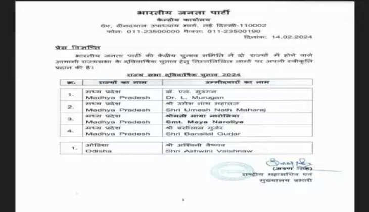 भाजपा की विज्ञप्ति के अनुसार, मध्य प्रदेश से डॉ. एल मुरुगन, उमेश नाथ महाराज, माया नरोलिया, बंसी लाल गुर्जर को उम्मीदवार बनाया है, जबकि राज्यसभा के लिए ओडिशा से अश्विनी वैष्णव से उम्मीदवार बनाया गया है। उल्लेखनीय है कि राज्यसभा सीटों के लिए 27 फरवरी को वोटिंग करवाई जाएगी और नामांकन की अंतिम तारीख 15 फरवरी है।