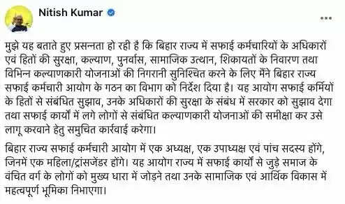 नीतीश कुमार ने आज सुबह एक्स पोस्ट कर लिखा कि बिहार में सफाई कर्मचारियों के अधिकारों एवं हितों की सुरक्षा, कल्याण, पुनर्वास, सामाजिक उत्थान, शिकायतों के निवारण तथा विभिन्न कल्याणकारी योजनाओं की निगरानी सुनिश्चित करने के लिए विभाग को बिहार राज्य सफाई कर्मचारी आयोग के गठन का निर्देश दिया है।