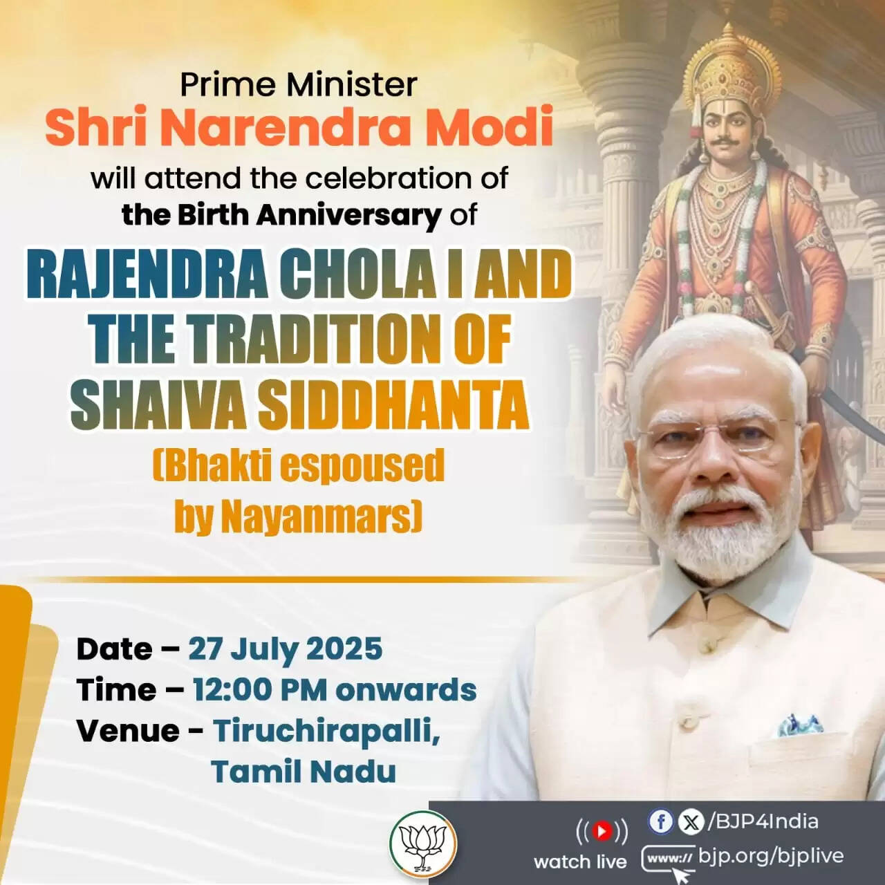 तिरुचिरापल्ली, 27 जुलाई (हि.स.)। तमिलनाडु की अपनी यात्रा के दूसरे और अंतिम दिन रविवार को प्रधानमंत्री नरेन्द्र मोदी चोल सम्राट राजेंद्र चोल प्रथम की विरासत को समर्पित प्रमुख सांस्कृतिक और ऐतिहासिक कार्यक्रमों में शामिल होंगे।