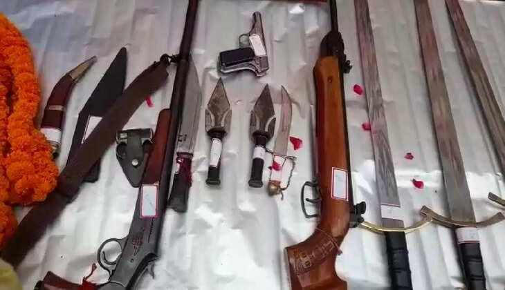 वाराणसी : विजयादशमी पर अंतरराष्ट्रीय हिन्दू परिषद, राष्ट्रीय बजरंग दल ने किया शस्त्र पूजन