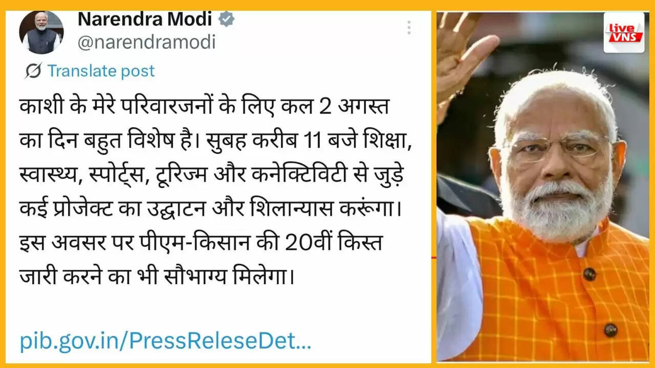 काशी के मेरे परिवारजनों के लिए कल 2 अगस्त का दिन बहुत विशेष है। सुबह करीब 11 बजे शिक्षा, स्वास्थ्य, स्पोर्ट्स, टूरिज्म और कनेक्टिविटी से जुड़े कई प्रोजेक्ट का उद्घाटन और शिलान्यास करूंगा। इस अवसर पर पीएम-किसान की 20वीं किस्त जारी करने का भी सौभाग्य मिलेगा।