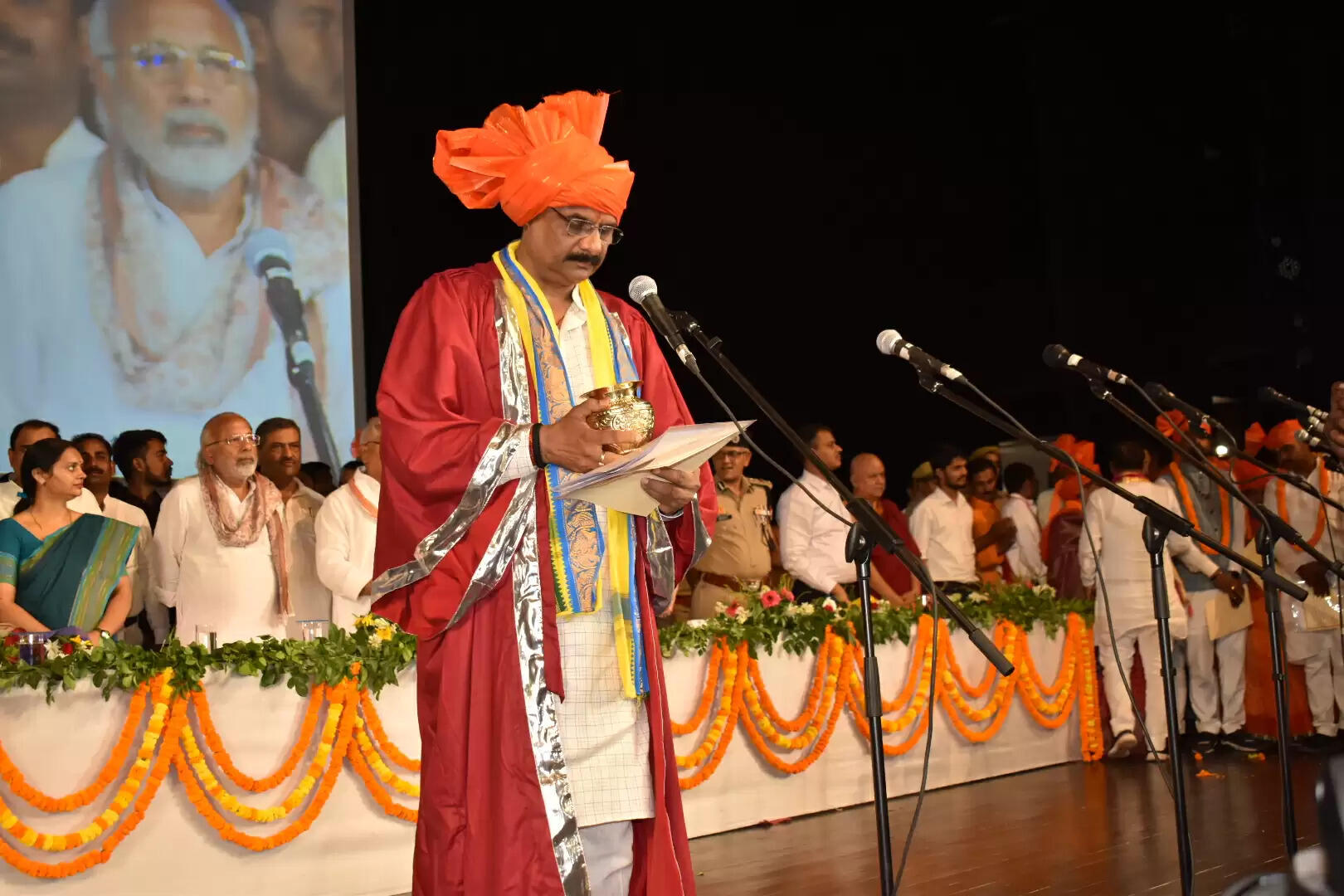 वाराणसी। नगर निगम के नव निर्वाचित महापौर अशोक तिवारी ने शुक्रवार शाम सिगरा स्थित इंटरनेशनल रुद्राक्ष कंन्वेंशन सेंटर में संस्कृत में पद और गोपनीयता की शपथ ली। खचाखच भरे हाल में शपथ ग्रहण के साथ तालियों की गड़गड़हाट गूंज उठी। शपथ लेने के बाद उन्हें उप मुख्यमंत्री केशव प्रसाद मौर्य समेत तमाम मंत्रियों ने बधाई दी। बुके देकर स्वागत किया और नई जिम्मेदारी के लिए शुभकामनाएं दी। मेयर के बाद पार्षदों का शपथ ग्रहण समारोह शुरू हुआ। वार्डों के पांच-पांच पार्षदों ने मंच पर आकर शपथ लिया। नवनिर्वाचित 2 सभासदों ने संस्कृत एवं चार मुस्लिम महिलाओं ने उर्दू में शपथ ली।