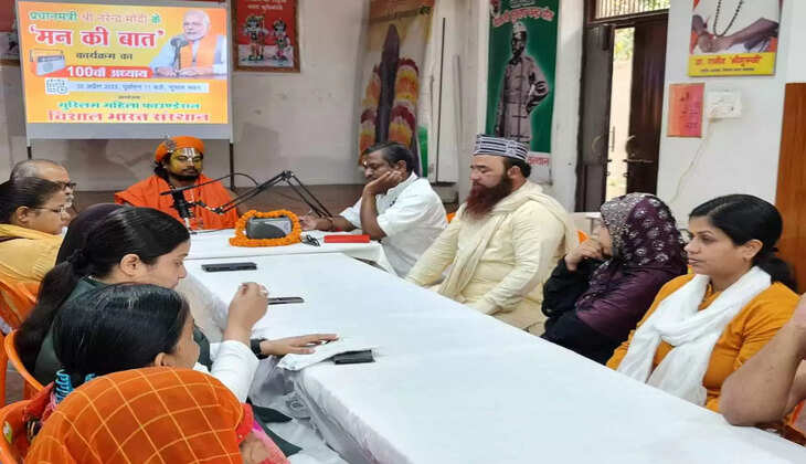 वाराणसी। प्रधानमंत्री नरेंद्र मोदी के प्रमुख कार्यक्रम मन की बात के 100 वें संस्करण को रविवार को प्रसारित किया गया। पीएम के मन की बात को लेकर पूरे देश में उत्साह का माहौल देखने को मिला। वहीं प्रधानमंत्री के संसदीय क्षेत्र वाराणसी में महंत मौलाना और हिंदू- मुस्लिम समाज की महिलाएं एक साथ बैठ प्रधानमंत्री नरेंद्र मोदी के मन की बात के सभी संस्करण को सुना।प्रधानमंत्री नरेन्द्र मोदी के मन की बात के 100वें अध्याय को उत्सव की तरह सुनने के लिए मुस्लिम महिला फाउण्डेशन एवं विशाल भारत संस्थान ने लमही के सुभाष भवन में विशेष आयोजन किया। इस कार्यक्रम में संत, मौलाना, मुस्लिम महिलाएं, दलित समुदाय के लोग, घरेलू एवं कामकाजी महिलाओं ने भागीदारी की।