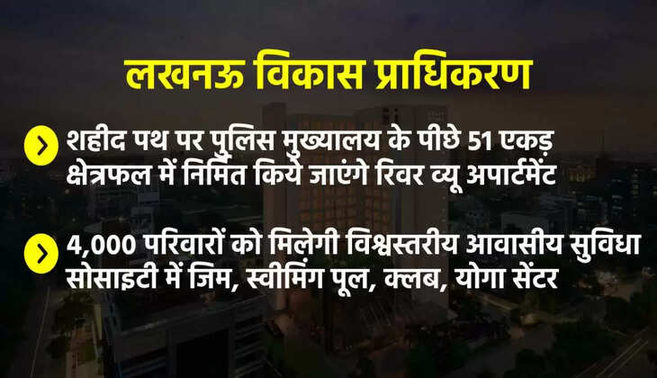 शहीद पथ पर पुलिस मुख्यालय के पीछे 51 एकड़ भूमि पर 2500 करोड़ रुपये की लागत से रिवर व्यू अपार्टमेंट बनाए जाएंगे। यह ग्रुप हाउसिंग परियोजना लगभग 4000 परिवारों को विश्वस्तरीय आवासीय सुविधाएं प्रदान करेगी। गोमती नदी के किनारे बने इन अपार्टमेंट्स में 1 BHK से 4 BHK फ्लैट्स और पेंटहाउस के साथ-साथ EWS और LIG श्रेणी के भवन भी होंगे। सोसाइटी में जिम, स्वीमिंग पूल, क्लब, योगा सेंटर जैसी आधुनिक सुविधाएं उपलब्ध होंगी।