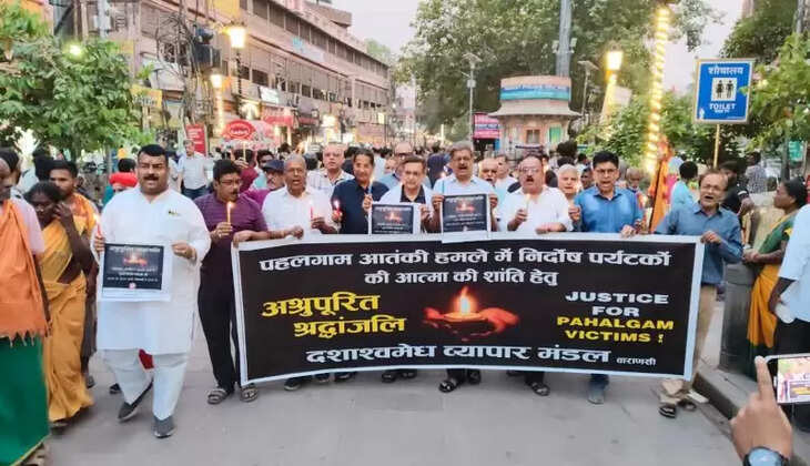 पहलगाम आतंकी हमले के विरोध में काशी में व्यापारियों ने निकाला कैंडल मार्च, पाकिस्तान प्रायोजित आतंकवाद को नेस्तनाबूत करने की मांग