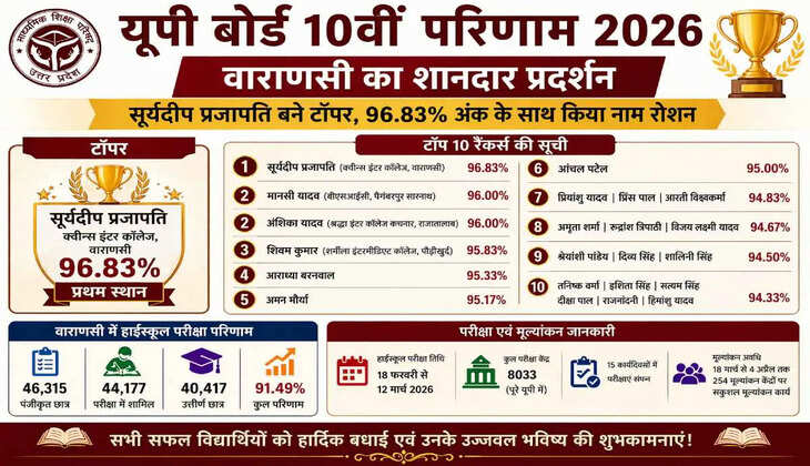 UP Board Result 2026: वाराणसी में 10वीं में 91.49% छात्र सफल, सूर्यदीप प्रजापति बने टॉपर, 96.83% अंक के साथ किया नाम रोशन, देखिए टॉप 10 लिस्ट