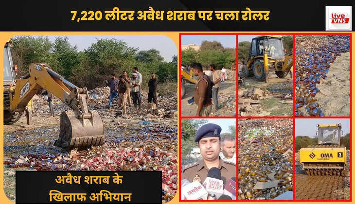 वाराणसी : अवैध शराब की बोतलों पर चला रोलर, 7220 लीटर अवैध शराब कराई गई नष्ट