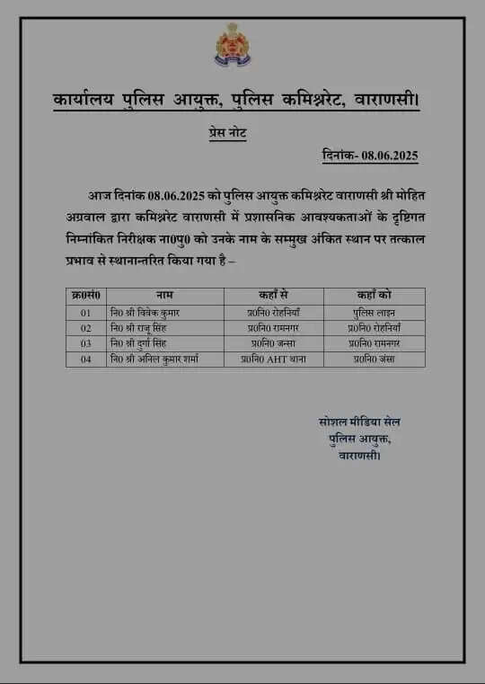 वाराणसी : रोहनियां एसओ लाइनहाजिर, चार इंस्पेक्टर ट्रांसफर, जानिये कौन कहां गया