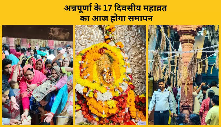 वाराणसी। श्रद्धालुओं के लिए सुख-समृद्धि का प्रतीक, मां अन्नपूर्णा का 17 दिवसीय महाव्रत शनिवार को पूर्ण होगा। इस पावन अवसर पर श्रद्धालु मां अन्नपूर्णा का दर्शन-पूजन कर अपने व्रत का पारण करेंगे। मंदिर परिसर और गर्भगृह को धान की बालियों से भव्य रूप से सजाया गया है। मंगला आरती के साथ ही मंदिर में दर्शन-पूजन का शुभारंभ होगा।
