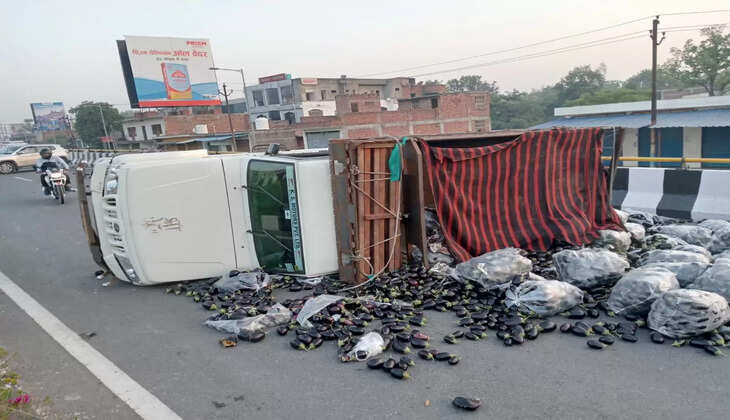 फ्लाईओवर पर बाईक सवार को बचाने के चक्कर में पलटी सब्जी लदी पिकअप