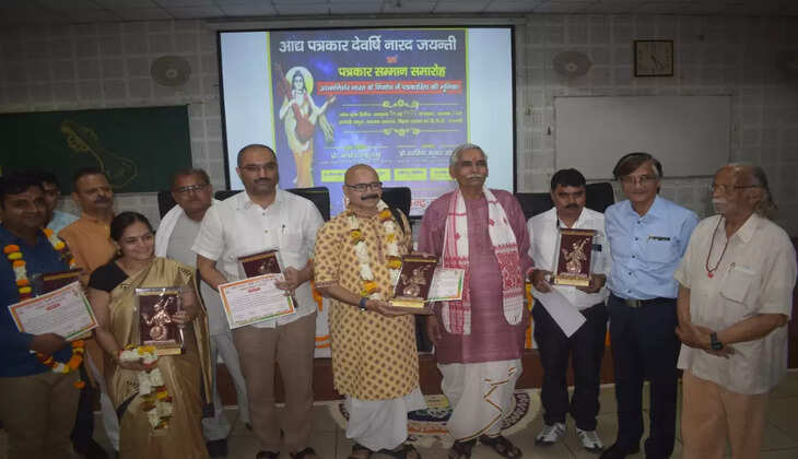 वाराणसी। बीएचयू स्थित विज्ञान संकाय महामना सभागार सगोष्ठी संकुल में पत्रकार देवर्षि नारद जयंती व पत्रकार सम्मान समारोह का आयोजन किया गया। इस अवसर पर पत्रकारिता के क्षेत्र में विशिष्ट कार्य करने वाले सात पत्रकारों को मुख्य अतिथि कुशाभाऊ ठाकरे पत्रकारिता विश्वविद्यालय, रायपुर-छत्तीसगढ़ के कुलपति प्रो.बलदेव शर्मा ने नारद जी प्रतीक चिन्ह व सम्मान पत्र देकर उन्हें सम्मानित किया।