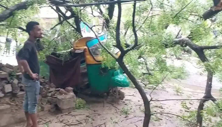 तेज तूफान-बारिश में गिरा विशाल नीम का पेड़, ऑटो चकनाचूर; महिलाएं-बच्चे बाल-बाल बचे, घंटों जाम