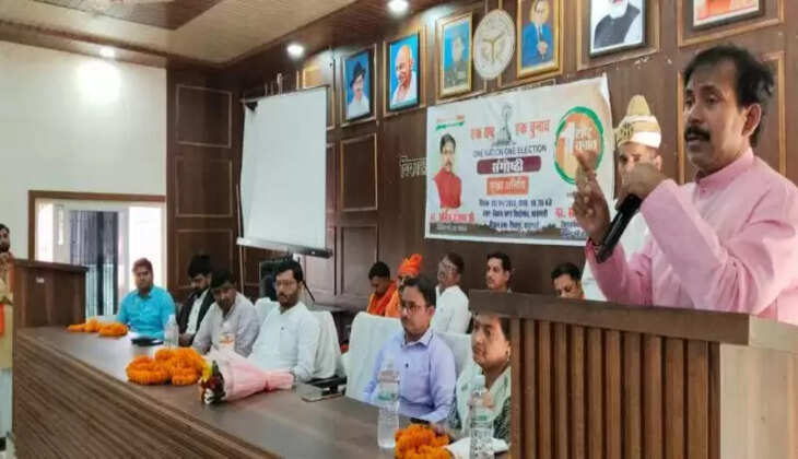 वाराणसी। चिरईगांव ब्लॉक सभागार में शुक्रवार को "एक राष्ट्र, एक चुनाव" विषय पर एक संगोष्ठी का आयोजन किया गया। कार्यक्रम की शुरुआत में पहलगाम आतंकी हमले में शहीद हुए लोगों को दो मिनट का मौन रखकर श्रद्धांजलि दी गई। कार्यक्रम में प्रदेश के कैबिनेट मंत्री अनिल राजभर ने वन नेशन वन इलेक्शन से फायदे बताए। साथ ही विपक्षी दलों पर निशाना साधा।