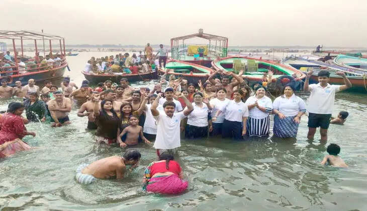 वाराणसी : गंगा में खड़े होकर आतंकवाद के खिलाफ लगाए नारे, सफाई कर स्वच्छता का दिया संदेश