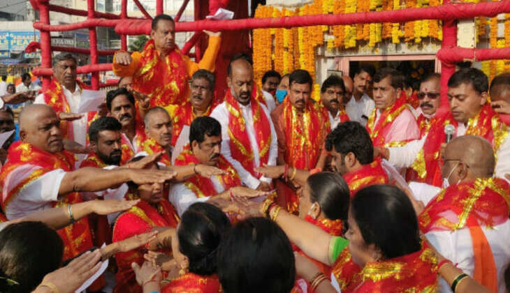 मंदिर समिति ने संजय कुमार, विधायक राजा सिंह और अन्य कॉरपोरेटर्स का स्वागत किया और संकल्प लेने से पहले इन लोगों ने मंदिर में दर्शन किए।