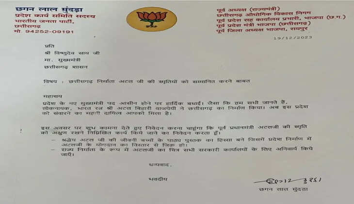 रायपुर, 19 दिसंबर (हि.स.)।औद्योगिक विकास निगम के पूर्व अध्यक्ष छगन लाल मुंदड़ा ने मुख्यमंत्री विष्णुदेव साय जी से मुलाकात कर पूर्व प्रधानमंत्री अटल बिहारी वाजपेयी की जीवनी को पाठ्य पुस्तक का हिस्सा बनाए जाने की मांग की है।इस संबंध में मंगलवार को उन्होंने मुख्यमंत्री को मांगपत्र सौंपा है ।