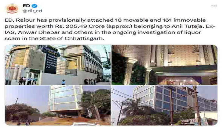 रायपुर , 3 मई (हि.स.)। छत्तीसगढ़ के बहुचर्चित शराब घोटाले मामले में प्रवर्तन निदेशालय (ईडी) ने पूर्व आईएएस अनिल टुटेजा और रायपुर के मेयर एजाज ढेबर के भाई अनवर ढेबर समेत कई आरोपितों की लगभग 18 चल और 161 अचल संपत्तियों को अस्थायी रूप से कुर्क किया है। कुर्क किए संपत्ति कीमत करीब 205.49 करोड़ रुपये बताई जा रही है। इस बात की जानकारी ईडी ने शुक्रवार को सोशल मीडिया एक्स में पोस्ट करके दी है। ईडी ने पोस्ट में लिखा कि, इन संपत्तियों में 18 चल और 161 अचल संपत्तियां हैं। इसका संबंध पूर्व आईएएस अफसर अनिल टुटेजा, अनवर ढेबर और शराब घोटाले से जुड़े अन्य लोगों से है।
