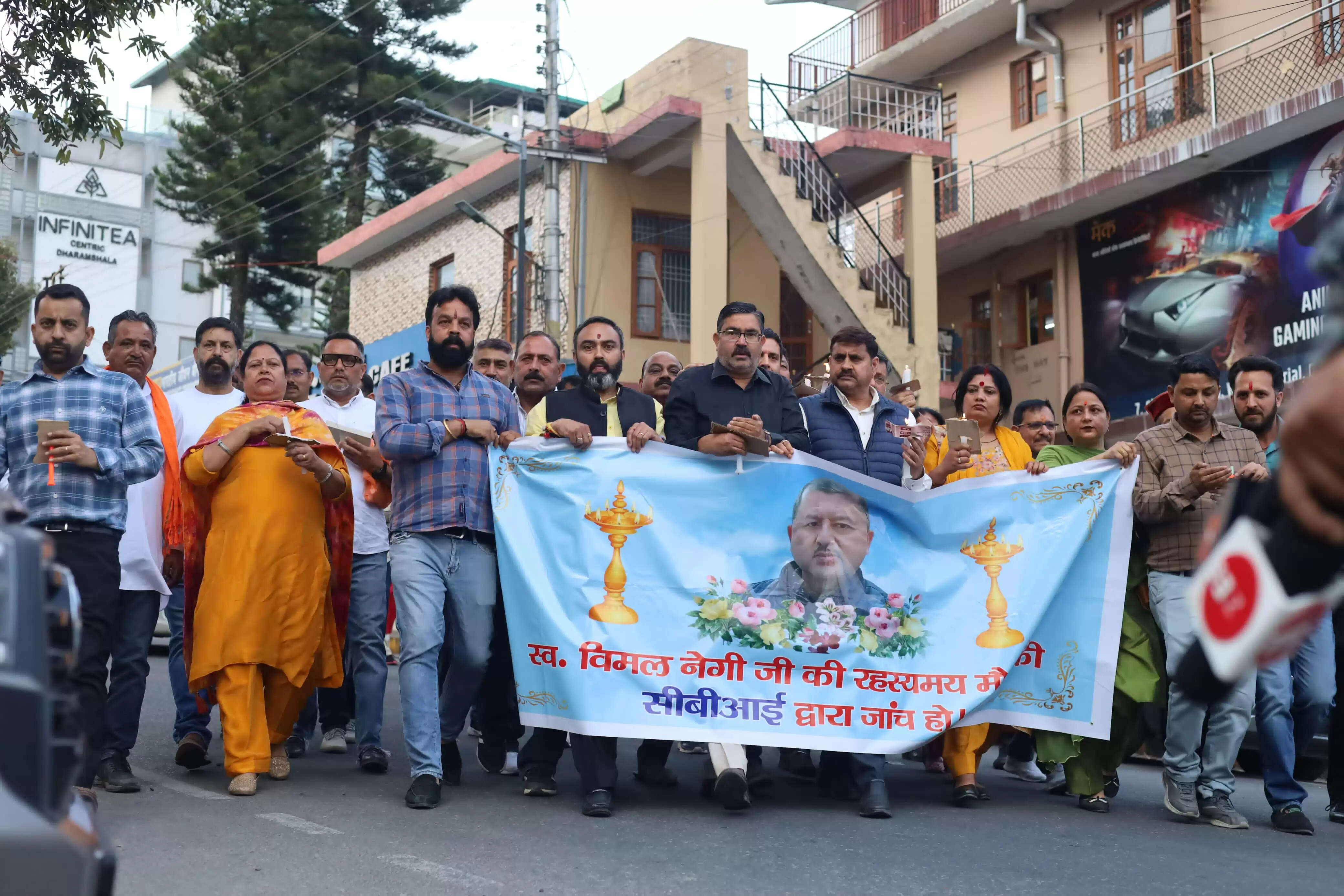 स्वर्गीय इंजीनियर विमल नेगी की रहस्यमयी मृत्यु पर जहां पूरे प्रदेश जनता कैंडल मार्च निकाल रही है वहीं आज इसी कड़ी में धर्मशाला में भी लोगों द्वारा कैंडल मार्च निकाला गया। स्थानीय लोगों ने वीरवार शाम कचहरी अड्डा से शहीद स्मारक तक कैंडल मार्च निकाला, उसके बाद दिवंगत विमल नेगी को श्रद्धांजलि दी। भाजपा नेता पवन काजल के नेतृत्व में यह मार्च निकाला गया।