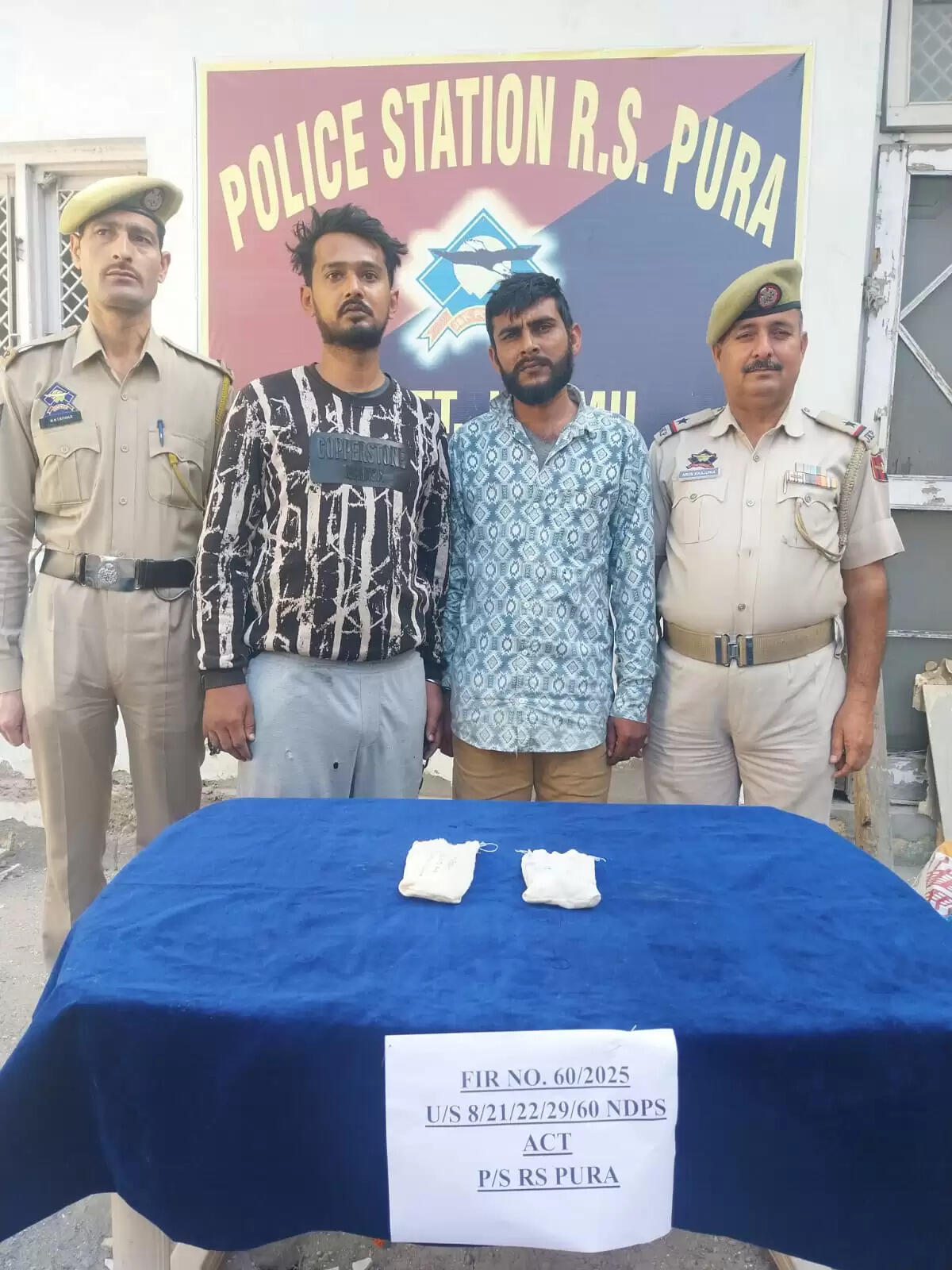पुलिस स्टेशन आर.एस. पुरा में एनडीपीएस अधिनियम (8/21/22/29/60) की संबंधित धाराओं के तहत एफआईआर संख्या 60/2025 के तहत मामला दर्ज किया गया है। आगे की जांच जारी है।