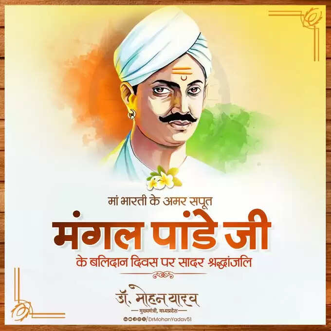 एक अन्य संदेश के माध्यम से सीएम डाॅ यादव ने अमर शहीद मंगल पांडे काे पुण्यतिथि पर याद करते हुए कहा 1857 की क्रांति के अग्रदूत, मां भारती के अमर सपूत मंगल पांडे जी के बलिदान दिवस पर सादर श्रद्धांजलि अर्पित करता हूँ। अंग्रेजी हुकूमत की जड़ों को हिलाकर आपने देशभक्ति, त्याग और समर्पण से स्वतंत्रता की पहली चिंगारी जलायी। आपका अदम्य साहस और शौर्य आज भी हमें राष्ट्रसेवा और स्वाभिमान की प्रेरणा देता है।