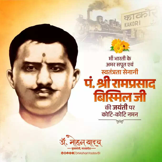 सीएम डॉ. यादव ने सोशल मीडिया एक्स पर पोस्ट करते हुए लिखा मां भारती की परतंत्रता की बेड़ियों को तोड़ने के लिए जीवन समर्पित करने वाले महान स्वतंत्रता सेनानी, श्रद्धेय रामप्रसाद 'बिस्मिल' की जयंती पर कोटिश: नमन करता हूं। काकोरी एक्शन सहित विभिन्न प्रयासों से आपने दमनकारी हुकूमत की जड़ें हिला दीं और असंख्य देशवासियों को स्वतंत्रता प्राप्ति के लिए प्रेरित किया। आपके चरणों में बारंबार प्रणाम करता हूं।