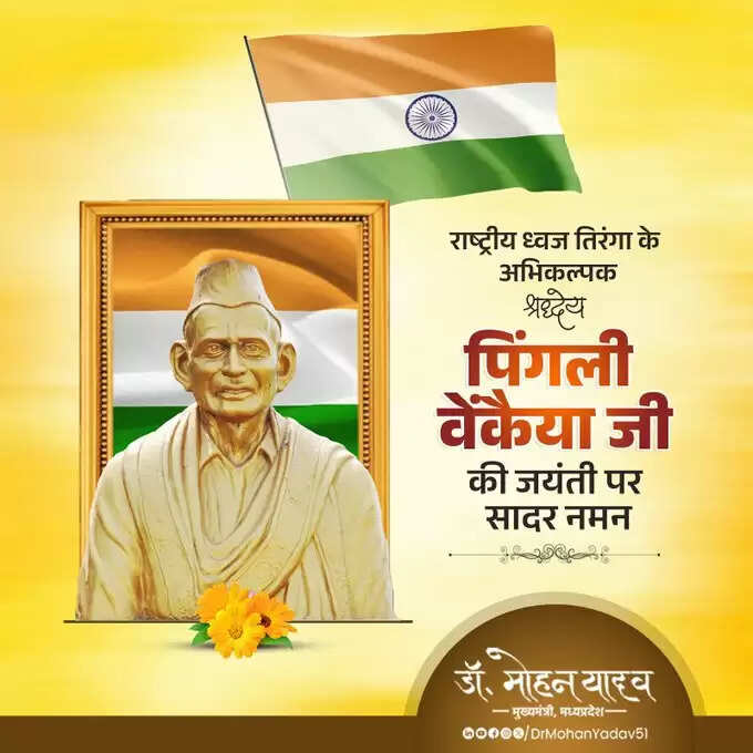 मुख्यमंत्री डाॅ. यादव ने साेशल मीडिया एक्स पर पाेस्ट कर पिंगली वेंकैया काे जयंती पर याद करते हुए लिखा स्वतंत्रता सेनानी व राष्ट्रीय ध्वज के अभिकल्पक, श्रद्धेय पिंगली वेंकैया जी की जयंती पर सादर नमन करता हूं। तिरंगा के माध्यम से उन्होंने राष्ट्र के सम्मान, स्वाभिमान, संस्कृति, एकता, और कला को रंग एवं प्रतीक से निरूपित कर ऐसे ध्वज का निर्माण किया, जो प्रत्येक भारतीय के ह्रदय में आन-बान-शान का गौरव संचारित करता है।