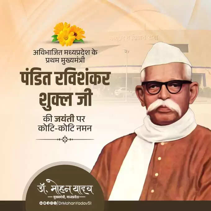 एक अन्य संदेश के माध्यम से सीएम डाॅ. यादव ने स्वतंत्रता सेनानी पंडित रविशंकर शुक्ल काे जयंती पर नमन करते हुए लिखा स्वतंत्रता सेनानी, मध्यप्रदेश के प्रथम मुख्यमंत्री पंडित रविशंकर शुक्ल जी की जयंती पर सादर नमन करता हूं।प्रदेश के विकास में आपका योगदान सदैव याद किया जाएगा।