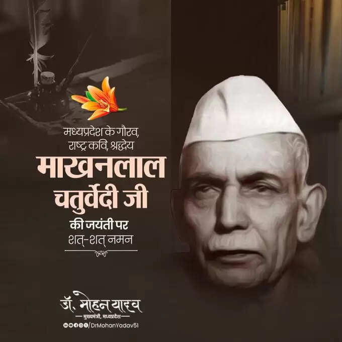 मुख्यमंत्री डाॅ यादव ने साेशल मीडिया एक्स पर पाेस्ट करते हुए लिखा मध्यप्रदेश के गौरव एवं हिन्दी पत्रकारिता के पुरोधा, राष्ट्रकवि श्रद्धेय माखनलाल चतुर्वेदी जी की जयंती पर शत्-शत् नमन करता हूं। आपकी लेखनी ने भारतीय स्वाधीनता आंदोलन को नई ऊर्जा दी और राष्ट्रभक्ति की भावना को सशक्त किया। पुष्प की अभिलाषा, सिपाही, सागर खड़ा बेड़ियाँ तोड़े... जैसी आपकी अनेक कालजयी कृतियां भावी पीढ़ियों को त्याग एवं देशभक्ति के लिए अनुप्रेरित करती रहेंगी।
