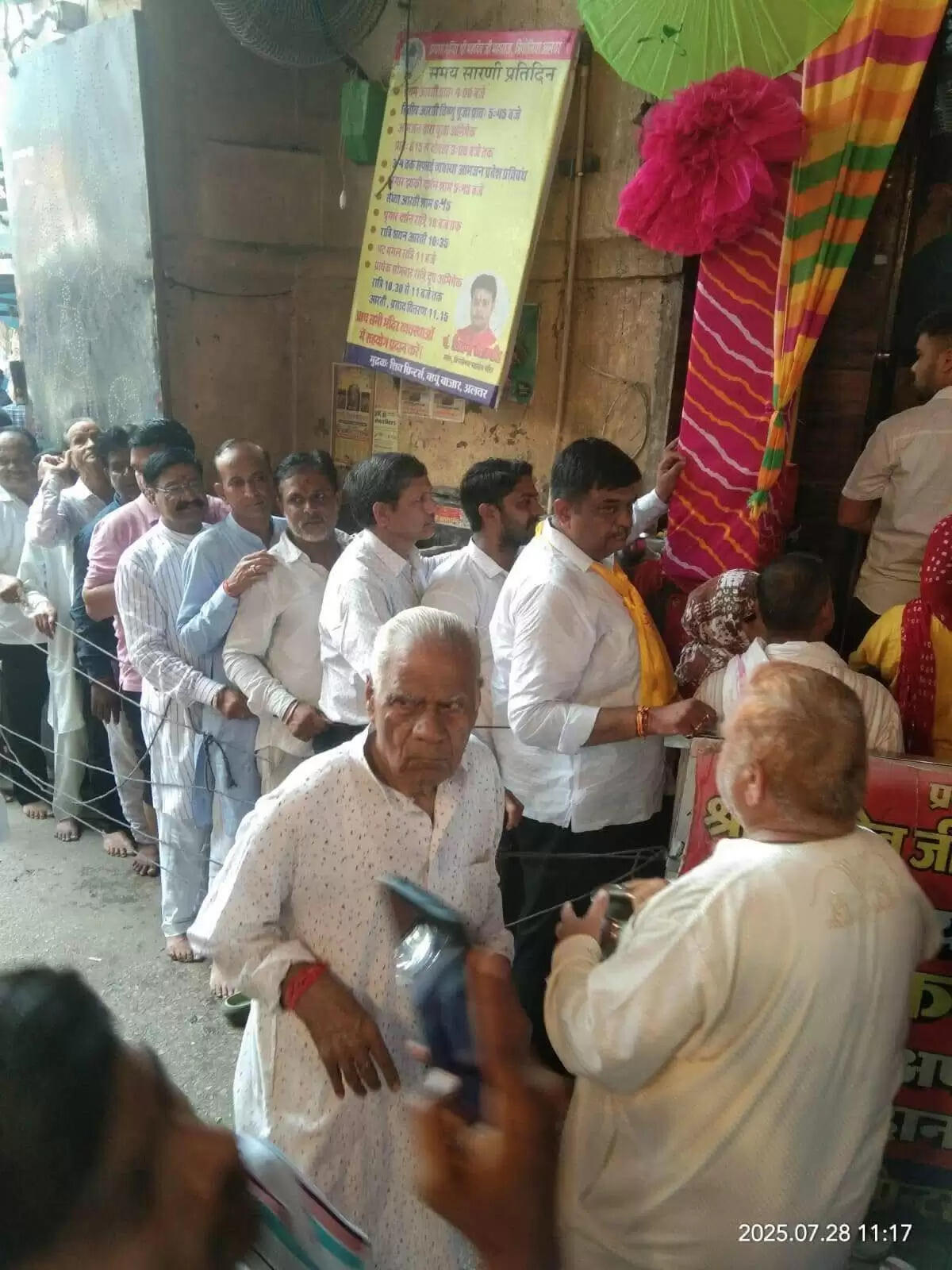 त्रिपोलिया महादेव मंदिर में जलाभिषेक के लिए मंत्री संजय शर्मा श्रद्धालुओं के साथ लाइन में लगे
