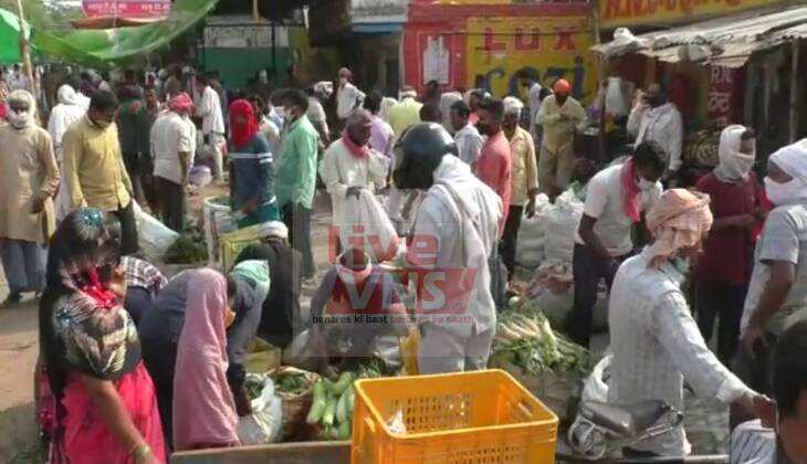 तस्वीरें कई साल पुरानी नहीं बल्कि कोरोना की विभीषिका झेल रहे शहर बनारस की प्रमुख सब्ज़ी मंडियों में से एक पंचकोशी की है। मंडी के अंदर सब्ज़ी व्यापारी और खरीददार सभी कोरोना से बेख़ौफ़ दिखे। पूरी मंडी परिसर में और सड़क पर हज़ारों लोगों की भीड़ बिना सोशल डिस्टेंसिंग और मास्क के सब्ज़ी खरीदती दिखाई दी।