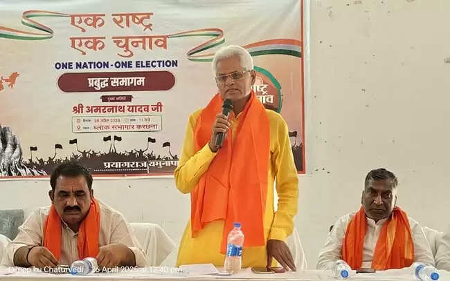 --वन नेशन वन इलेक्शन देश के विकास का कीर्तिमान स्थापित करेगा : राजेश शुक्ल --यमुनापार के करछना में एक राष्ट्र एक चुनाव प्रबुद्ध सम्मेलनप्रयागराज, 26 अप्रैल (हि.स.)। एक राष्ट्र-एक चुनाव के तहत प्रबुद्ध समागम का आयोजन शनिवार को ब्लाक सभागार करछना में जिलाध्यक्ष यमुनापार राजेश शुक्ल की अध्यक्षता में हुआ। मुख्य अतिथि भाजपा काशी क्षेत्रीय उपाध्यक्ष अमरनाथ यादव ने कहा कि बार-बार चुनाव से आम जनता, कर्मचारी, अधिकारी परेशान होते हैं। विकास का पहिया रूक जाता है। बार-बार चुनाव में जो आम जन पैसे विकास के लिए होते है वह खर्च होते हैं और मतदाता मतदान में रूचि नहीं रखते।