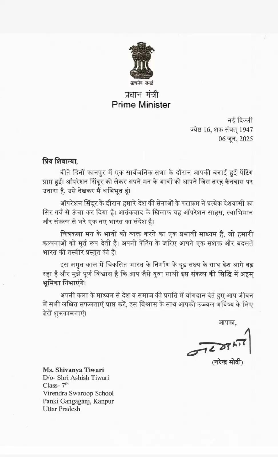 कानपुर, 10 जून (हि.स.)। बीती 30 मई को चंद्रशेखर आजाद कृषि विश्वविद्यालय (सीएसए) मैदान में आयोजित जनसभा को संबोधित करने प्रधानमंत्री नरेंद्र मोदी जनपद पहुंचे थे। इसी दौरान शहर के पनकी इलाके में रहने वाली सातवीं की छात्रा शिवन्या तिवारी ने पीएम को ऑपरेशन सिंदूर से जुड़ी एक पेंटिंग भेंट करी थी। जिस पर प्रधानमंत्री ने पेंटिंग की सरहाना करते हुए छात्रा काे पत्र लिखने का वादा किया था। पीएम ने वादा पूरा करते हुए छात्रा काे प्रशंसा पत्र भेज दिया और पत्र मिलते ही छात्रा व परिजनाें में खुशी का ठिकाना नहीं रहा।
