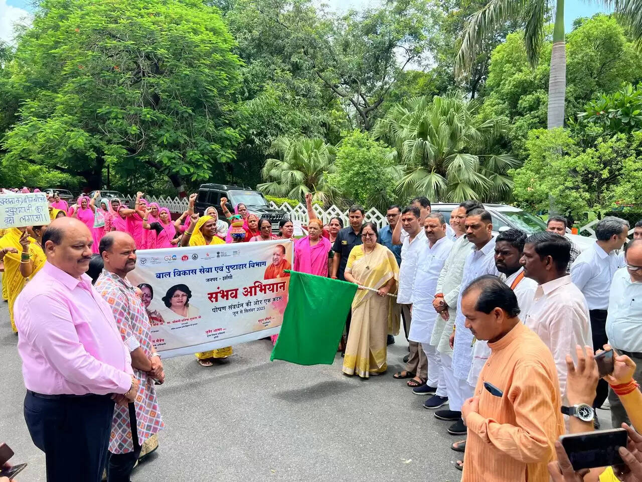 पोषण संवर्धन की ओर एक कदम के अन्तर्गत गर्भावस्था में पोषण की छः बातें, गर्भावस्था की पहली तिमाही में पंजीकरण, गर्भ के चौथे माह से प्रतिदिन कैल्शियम की दो गोलियों का सेवन करने की सलाह दें। साथ ही उनके द्वारा आंगनबाडी कार्यकत्री को बहुत ही महत्वपूर्ण पद बताया गया, जो केन्द्र पर आने वाले बच्चों एवं गर्भवती व धात्री महिलाओं के लिए माता यशोधरा जैसी भूमिका निभाती है। आंगनबाडी केन्द्र पर आने वाले बच्चों को महत्वपूर्ण स्वास्थ्य संबधी जानकारी देकर उन्हे जीवन पर्यन्त स्वस्थ्य रखती है। केन्द्र पर आने वाले समस्त लाभार्थियों को वजन समय से लेते हुए उनके पोषण स्वास्थ्य में सुधार लाते हुए कार्य करें। प्रभारी मंत्री बेबीरानी मौर्य द्वारा सर्किट हाउस से हरी झंडी दिखाकर रैली का शुभारम्भ किया गया। रैली सर्किट हाउस से प्रारंभ होकर चित्रा चैराहा कमिश्नरी होते हुए बीकेडी चैराहे आदि का भ्रमण करते हुए विकास भवन पर सम्पन्न हुई। इस दौरान जिला पंचायत अध्यक्ष पवन गौतम, भारतीय जनता पार्टी महानगर अध्यक्ष हेमन्त परिहार, जिला कार्यकम अधिकारी विपिन कुमार मैत्रेय, अपर मुख्य चिकित्साधिकारी एनकेजैन, बाल विकास परियोजना अधिकारी दिनेश सिंह राजपूत, स्नेहा गुप्ता सहित समस्त मुख्य सेविकायें उपस्थित रही।