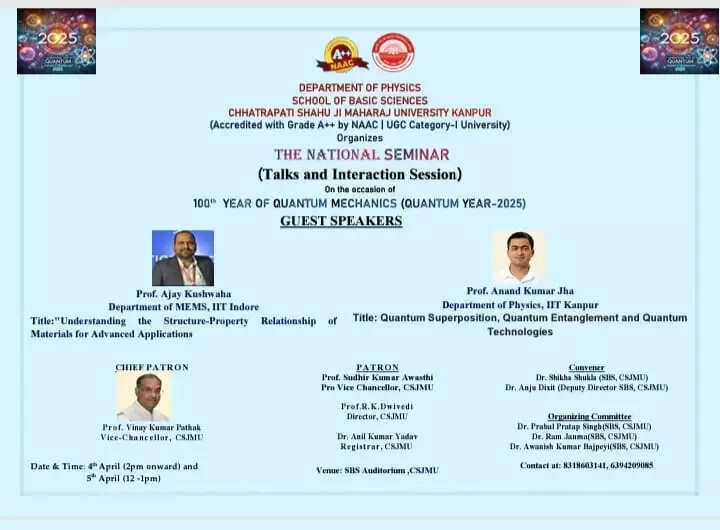 कानपुर, 04 अप्रैल (हि. स.)। छत्रपति शाहू जी महाराज विश्वविद्यालय के भौतिकी विभाग स्कूल ऑफ बेसिक साइंसेज द्वारा क्वांटम यांत्रिकी के 100 वें वर्ष का जश्न व राष्ट्रीय सेमिनार आयोजित हुआ है। यह जानकारी शुक्रवार को विश्वविद्यालय के कुलपति प्रो.विनय कुमार पाठक ने दी।