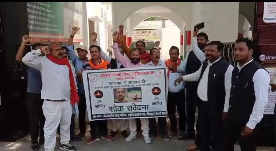 जौनपुर, 24 अप्रैल (हि.स.)। जम्मू-कश्मीर के पहलगाम में दाे दिन पूर्व मंगलवार को हुए आतंकी हमले में 26 पर्यटक मारे गये हैं। आतंकियों के इस कायराना हमले का विरोध पूरे देश और उत्तर प्रदेश में भी हो रहा है। इसी कड़ी में गुरुवार को अंतरराष्ट्रीय हिंदू परिषद और राष्ट्रीय बजरंग दल ने विरोध प्रदर्शन किया। प्रधानमंत्री सम्बोधित ज्ञापन जिलाधिकारी को सौंपा गया।