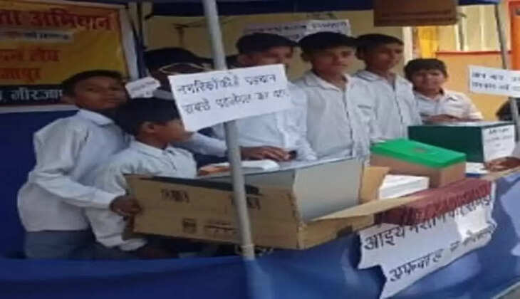 लोस चुनाव: प्रतीकात्मक ईवीएम बना मतदाताओं को जागरूक कर रहे बाल विज्ञानी