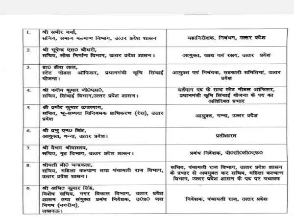 इनके अलावा सिंचाई विभाग के सचिव नवीन कुमार जीएस को वर्तमान पद के साथ प्रधानमंत्री कृषि सिंचाई योजना में राज्य नोडल अधिकारी का अतिरिक्त प्रभार दिया गया है। प्रमोद कुमार उपाध्याय को भूसंपदा विनियामक प्राधिकरण (रेरा) यूपी में सचिव पद से हटाकर गन्ना आयुक्त बनाया गया है। वहीं, गन्ना आयुक्त प्रभु एन सिंह को प्रतीक्षारत किया है। इसके साथ ही आईएएस वैभव श्रीवास्तव को प्रबंध निदेशक पीसीडीएफ बनाया गया है। आईएएस वैभव फिलहाल गृह विभाग में सचिव पद की जिम्मेदारी संभाल रहे थे। आईएएस बी चंद्रकला से पंचायती राज विभाग वापस ले लिया गया है। लेकिन उनके पास सचिव महिला कल्याण का पद रहेगा। अमित कुमार सिंह को पंचायती राज विभाग का निदेशक बनाया गया है। इससे पहले वह विशेष सचिव नगर विकास विभाग की जिम्मेदारी संभाल रहे थे।