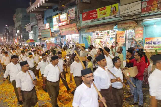 राष्ट्रीय स्वयंसेवक संघ के पथ संचलन में लोगों ने की पुष्प वर्षा