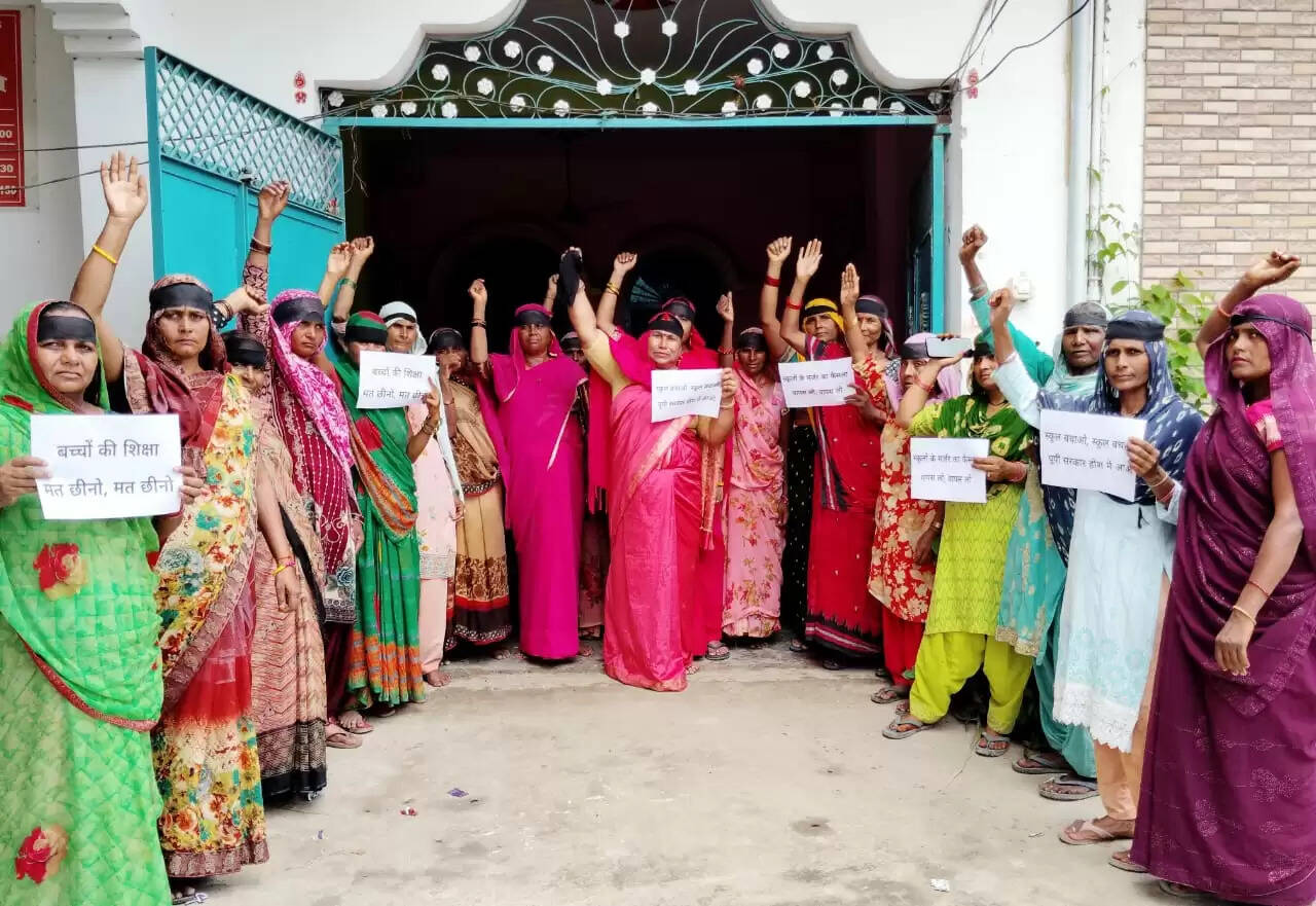 प्राथमिक स्कूलों को बंद करने के खिलाफ़ महिलाओं ने काली पट्टी बांध कर किया विरोध प्रदर्शन