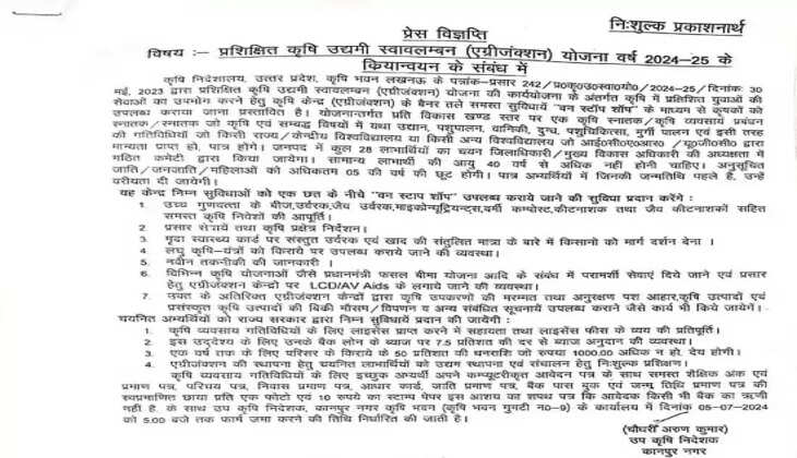 कानपुर,06 जून(हि.स.)। उत्तर प्रदेश सरकार प्रशिक्षित कृषि उद्यमी स्वावलंबन (एग्री जंक्शन) योजना की कार्य योजना के तहत वन स्टॉप शॉप के लिए आवेदन मांगा है। योजना के तहत 28 लाभार्थियों का चयन जिलाधिकारी एवं मुख्य विकास अधिकारी की अध्यक्षता में गठित कमेटी करेगी। यह जानकारी गुरुवार को उप कृषि निदेशक चौधरी अरुण कुमार ने दी।