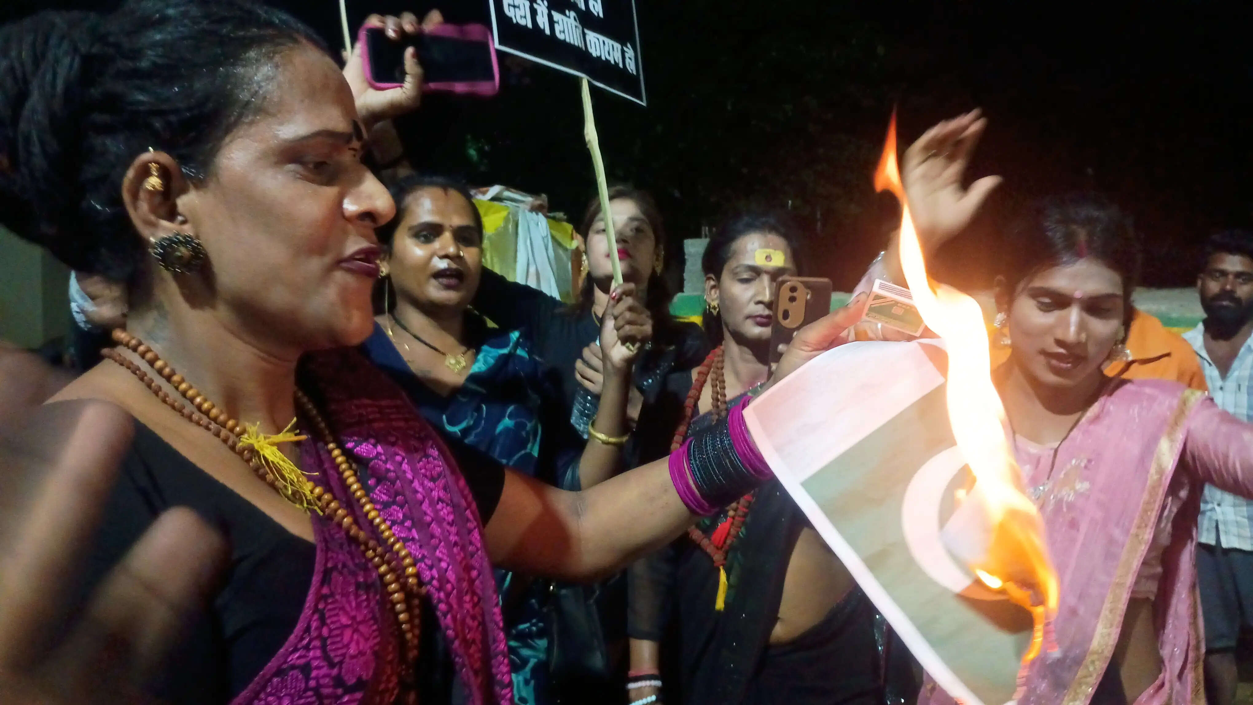 जौनपुर,28 अप्रैल (हि.स.)। 22 अप्रैल को जम्मू कश्मीर केपहलगाम में हुए आतंकी हमले के विरोध में किन्नरों ने सोमवार रात नगर के गांधी तिराहे से केंडिल मार्च निकाला और जमकर पाकिस्तान मुुर्दाबाद के नारे लगाये। साथ ही पाकिस्तान का झंडा जलाया और उस पर चप्पलों से पीटा। भारी संख्या में किन्नर समाज के लोगों ने नगर के विभिन्न मार्गों से पैदल मार्च करते हुए सद्भावना पुल पर आकर समाप्त किया। इस दौरान पाकिस्तान का झंडा जलाया और पैरो तले रौंदा ।